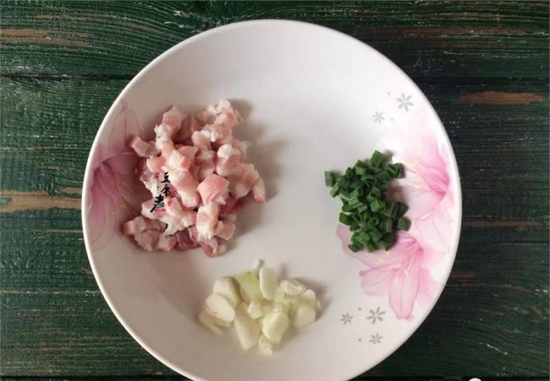 輔料的五花肉切小塊,蔥白及蔥葉分開使用