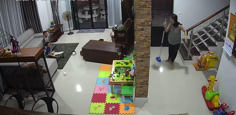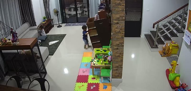 意外總是來得突然!好險小男孩靈活地閃開,沒有整個人被壓在櫃子底下,但他也因此被嚇得大哭!