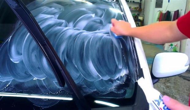 我們先用清水在玻璃上衝過一遍,後在海綿上倒油膜拔除劑(記得把雨刷拿起來),以同心圓方向刷洗,分區域擦拭,都擦拭完後再用水沖乾淨即可。此時會發現,水會形成一層水膜,且水很快地流下來(此時不會有水滴殘留),這就說明油膜去除差不多了,最後用幹抹布擦乾即可。