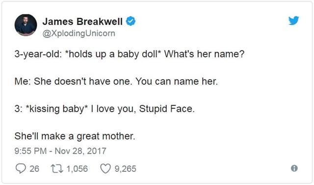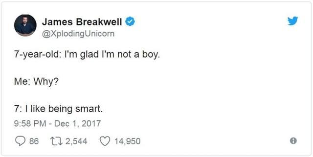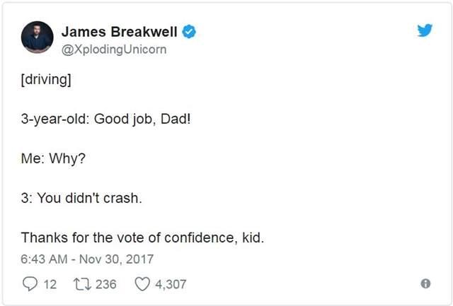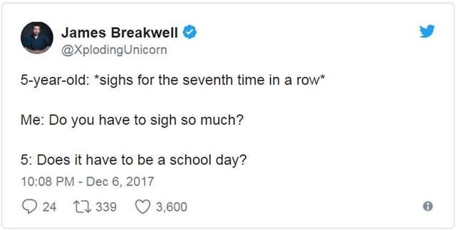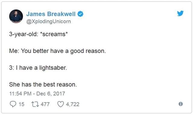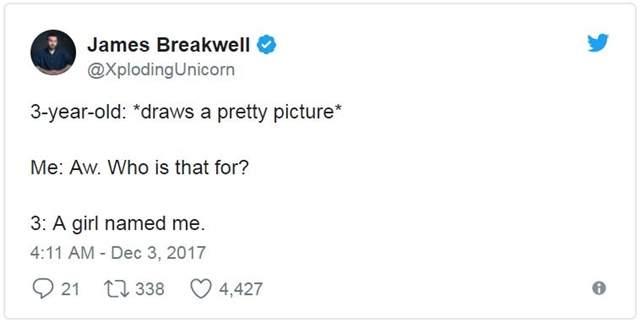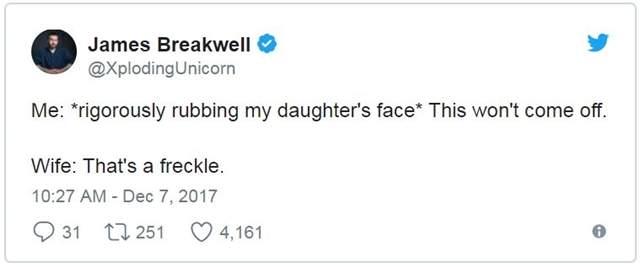 ▼James Breakwell是一位美國作家,家中有一位老婆與四位小天使女兒,每天都是從家人的歡笑聲中開始,既然已是人生勝利組了自然要把快樂與大家分享阿!所以不時把四千金所說的話重點記錄下來,父女間的碟對碟幽默互動常逗樂網友,長久下來就養出一堆讀者天天敲碗想知道女兒們又說了什麼有趣話~