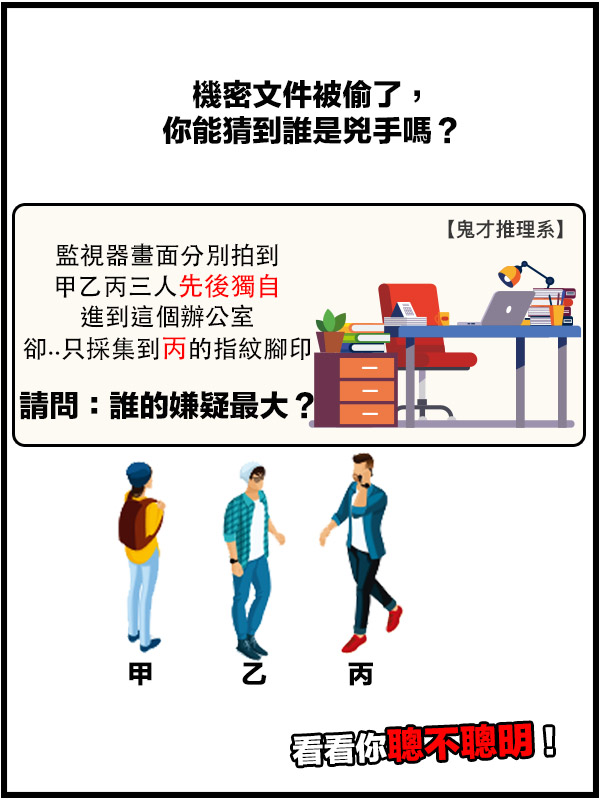 甲乙丙三人都曾進過辦公室,普通人一定會留下指紋甚至是腳印,