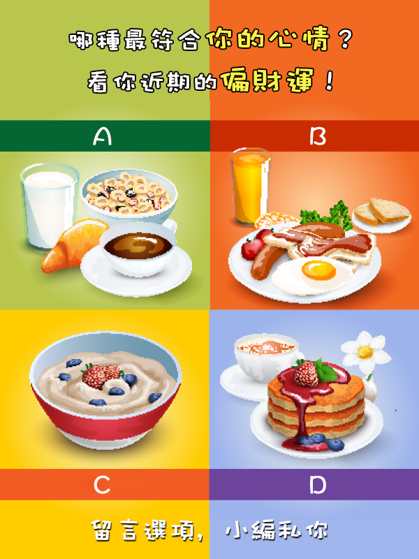 B:你近期的偏財運不太樂觀,建議你保守理財,不要去做盲目的投資,或是期待中樂透之樂的意外財,努力工作腳踏實地才是最重要的。