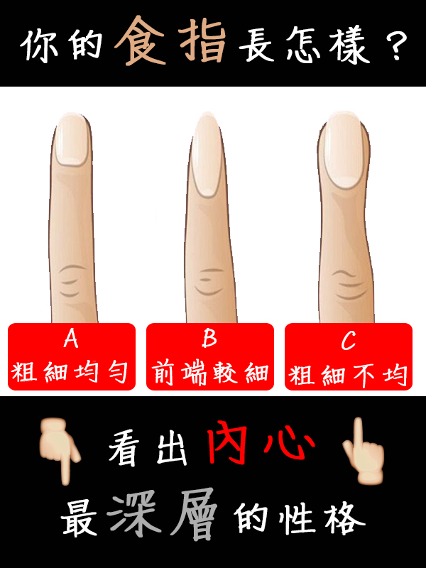 大家覺得有說中自己的個性嗎!想不到從手指的形狀竟然可以看出一個人的性格!果然每個人的個性都會表現在身體上嗎...以後認識新朋友的時候可以觀察一下對方的手指,看看對方是屬於哪種類型的人~