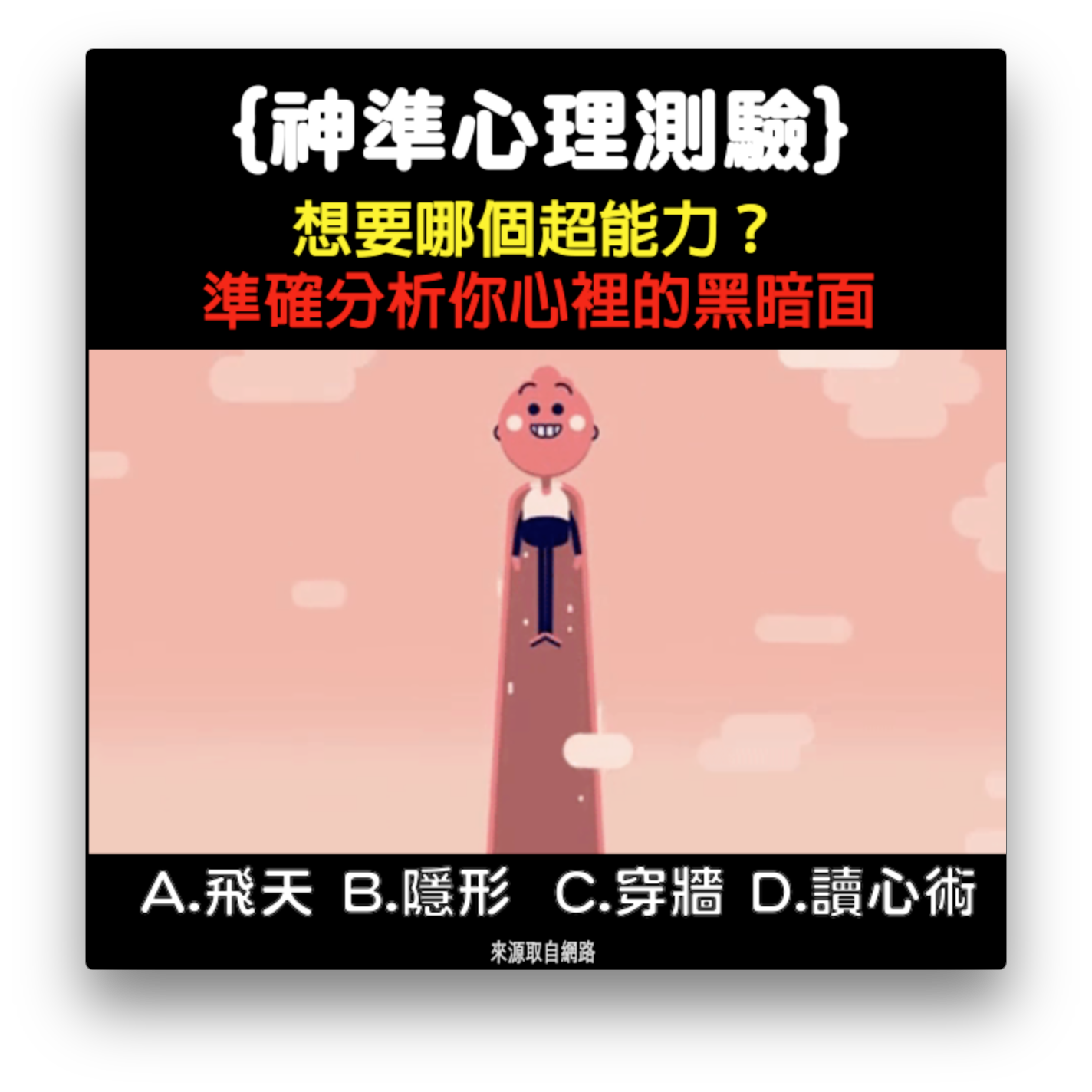 選擇想要飛上天的超能力的你,心中的黑暗面就是你的內心OS很多,你有點表裡不一,表面是沒事情,其實內心的小劇場超級多,所以大家都不知道你心裡在想什麼,是個難以摸透的人!
