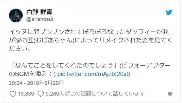 推主(@siranosui)家的達菲熊卻意外慘遭狗狗咬壞看不下去的阿嬤於是幫殘破的達菲熊修補了一番