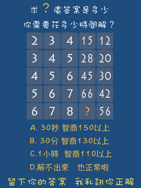 第五排6 7 8 ? 56 (7×8=56+ 7×5=91#)
