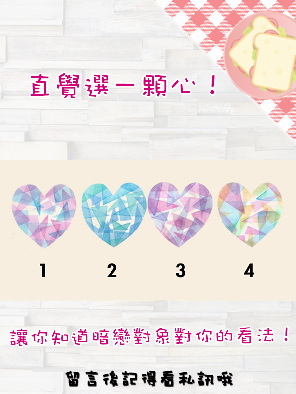 你暗戀的對像對你有一定程度的好感,但是他覺得你太過矜持、放不開了,其實他希望你可以好好的放鬆下來,展現你最自然的那一面。不要害怕對方因此對你有所改觀,有時當我們對別人坦承,反而會換來欣賞的眼光喔!因為我們都希望能看到別人真實的那一面! 分享出去,讓桃花開花結果吧!
