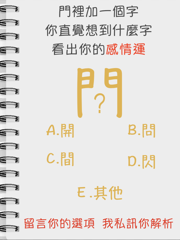 您的測試結果:假如你還在單身,這段時間很可能會遇到你的真愛,而且是很重要的人,會影響你整個往後的人生。 假如你有另一半,你們的感情很穩定,幾乎沒有什麼可以影響你們了,如果是有想要結婚的人,有這方面的打算,可以開始好好規劃了。