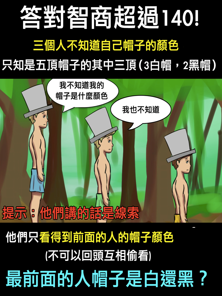 最後面的人說:「我不知道我的帽子是什麼顏色。」代表他不是看到兩頂白色,就是一黑一白的帽子。