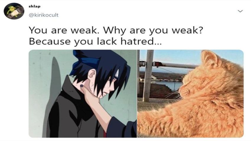 並附上:「你太弱了。為什麼這麼弱呢?因為你的憎恨還不夠…」的一句話,