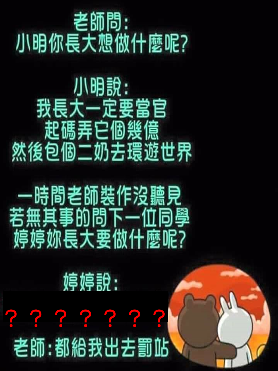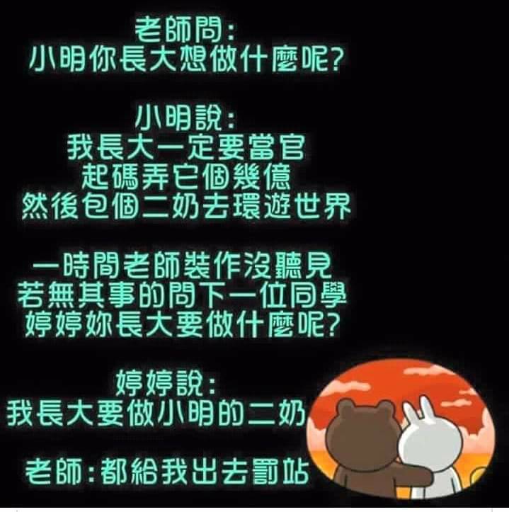 小明說:「我長大一定要當官,起碼弄它個幾億,然後包個二奶去環遊世界。」