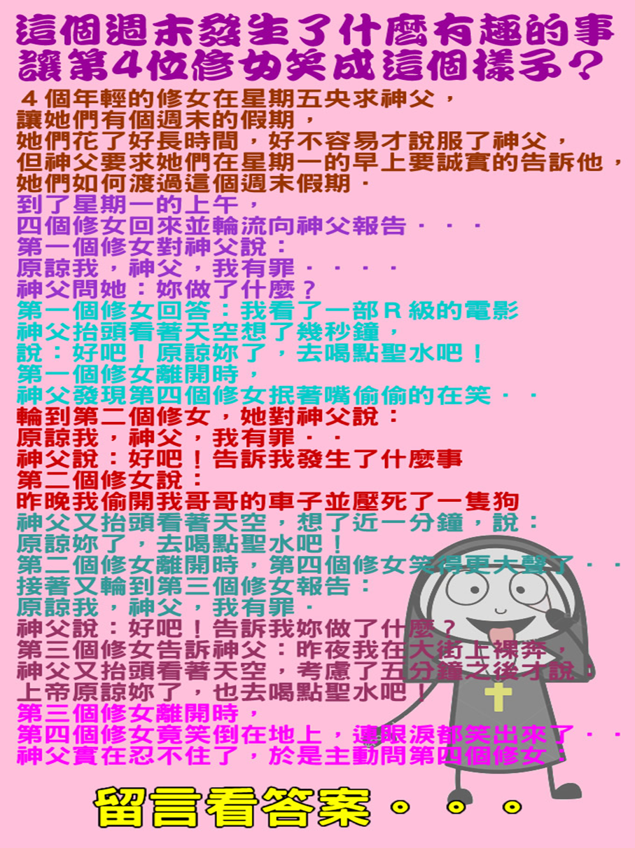 神父實在忍不住了,於是主動問第四個修女: