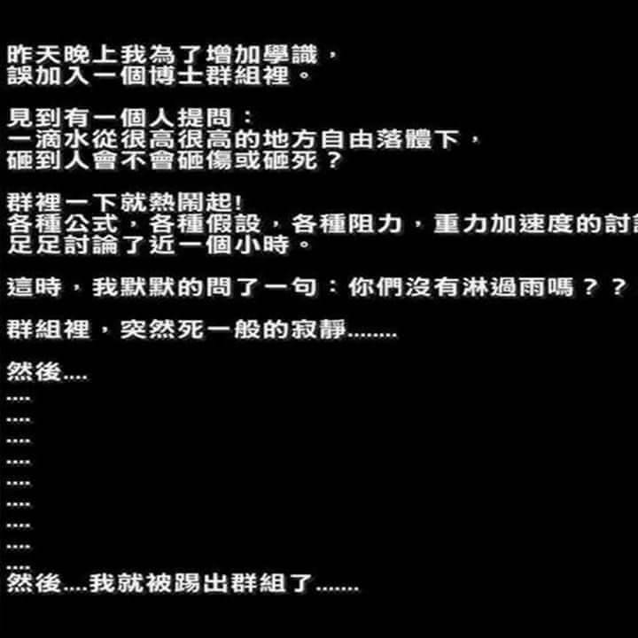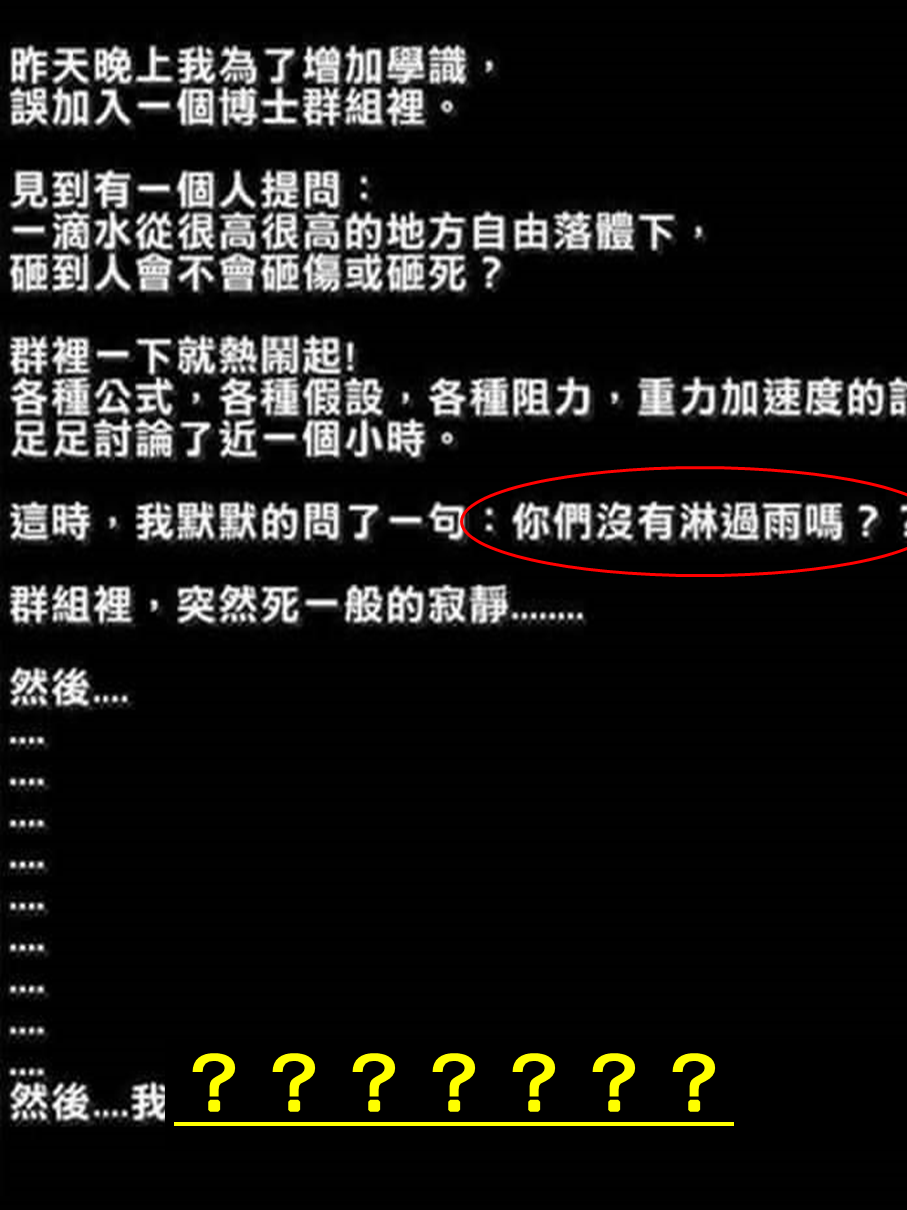 一個提問:「一滴水從很高很高的地方自由落體下,砸到人會不會砸死人?」 群組馬上熱鬧起來!這時候我問了一句...結果我被...
