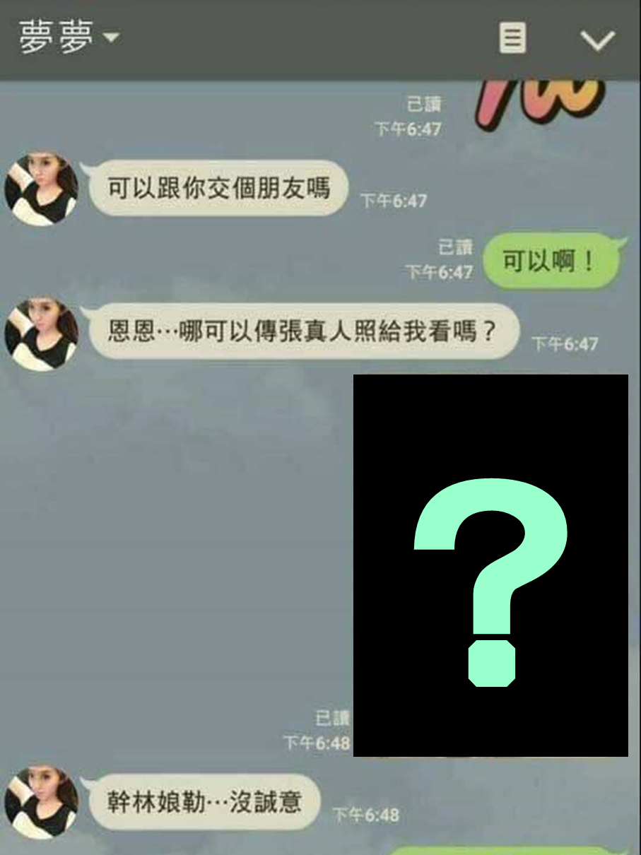 可以跟你交個朋友嗎?(可以啊!) 恩恩...那可以傳張真人照給我看嗎?