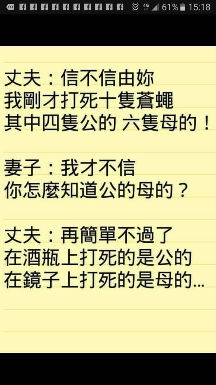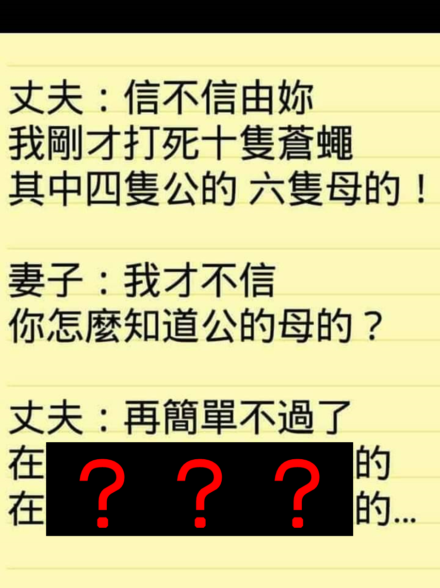 信不信由妳,我剛才才打死10隻蒼蠅,其中4隻公的6隻母的! (妻子:我才不信!妳怎麼知道公的母的?)