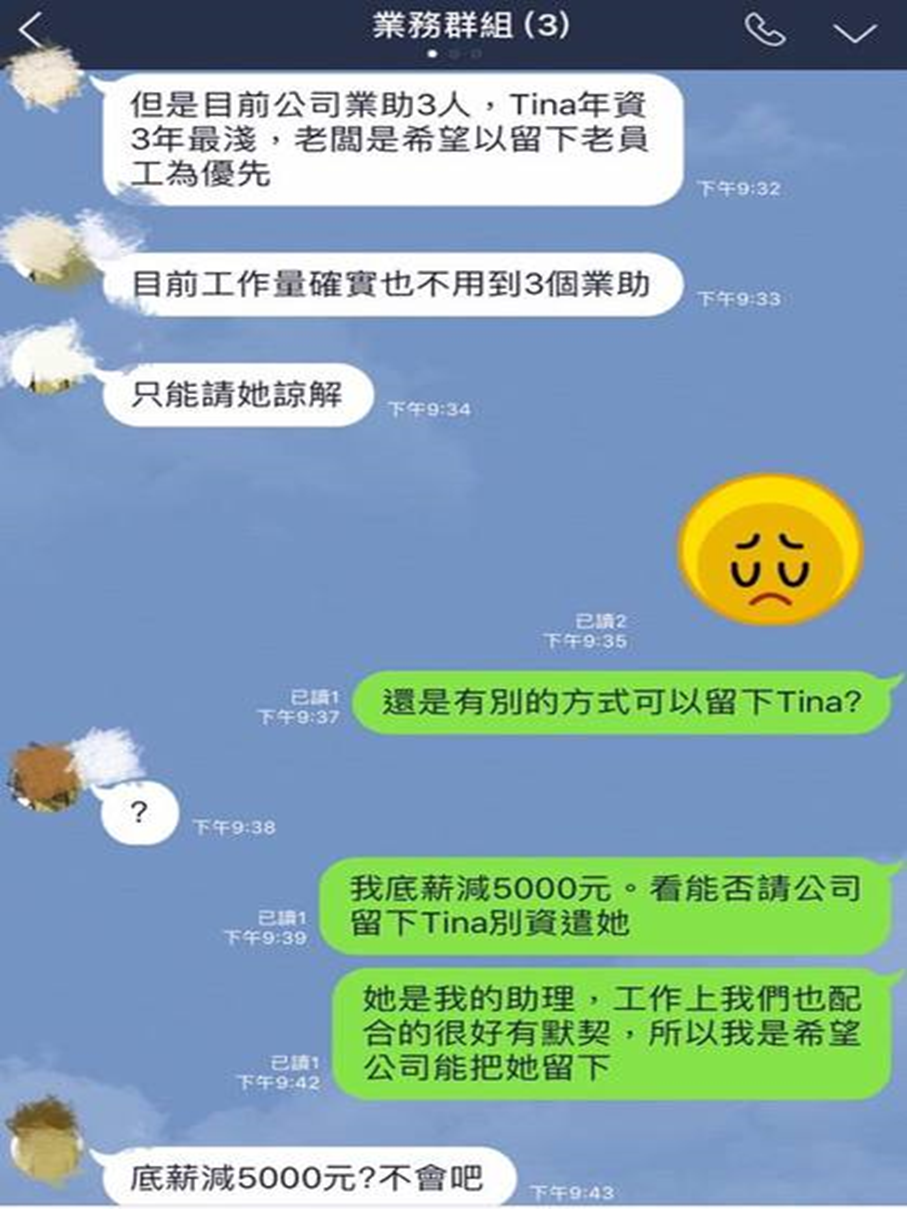 有1名在寢具類產品專櫃上班的網友,因為遇到公司裁減3到5人的人力,其中還包含她的一名業務助理Tina,因她3年的年資最淺,老闆希望只留下老員工,但她跟主管大力爭取要留下Tina,「我底薪減5000元,看能否公司留下Tina別資遣她」。她主管驚訝回「這犧牲也太大了」、「是我工作22年來首次聽到」,因此也大受感動,連主管也主動提「減薪部分我3000妳2000,明天我跟老闆談,盡力幫妳留下Tina」
