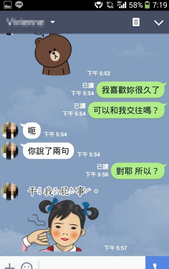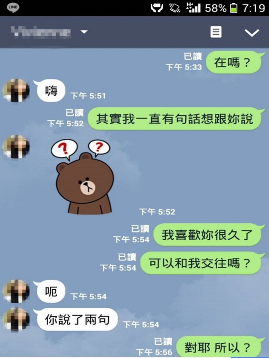 看完「干我屁事」後,樓主表示: 『昨天我們就沒下文了 也可以說是我沒回她 直到今天5.6節中間我們同班她主動來跟我搭話 問我昨天是不是玩真心話大冒險輸了 我跟她說晚點講就回去上課了 下課後我問她要不要去吃個鬆餅 我請客 (指的是學校附近的某間咖啡廳 她很喜歡那裡的鬆餅) 剛開始我們都沒什麼講話 直到她吃完鬆餅後我問她:「妳剛剛不是問我是不是玩真心話大冒險輸了嗎?」 她回:「嗯,是吧?」 我回:「喔,對啊」 再說:「不過我選的是真心話,我真的很喜歡妳,我知道昨天用line告白很瞎不過我是真的很希望妳加入我的精采生活。」 (我知道這是老梗,不過身為魯蛇我覺得能說出這句話對我來說已經跨出一大步了) 她沉默了一下,輕聲的說:「可以讓我再想想嗎?」 (後續就到這)』 小編:看來,是沒希望了,替樓主拍拍。