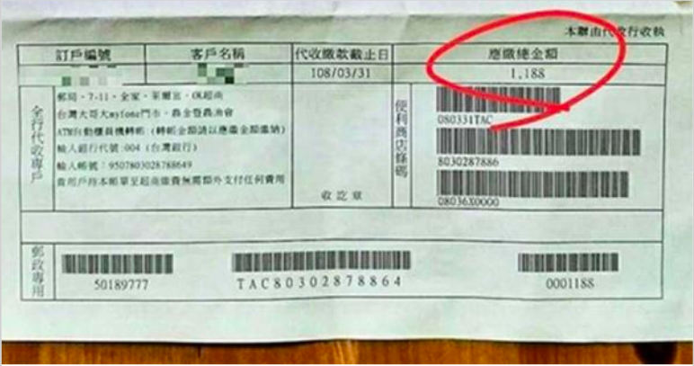 日前有網友在臉書《爆料公社》PO文表示,婆婆最近收到了一張第四台的「繳費台」,上頭標記了1188元的金額,好奇問夫妻倆怎麼會積欠第四台費用。