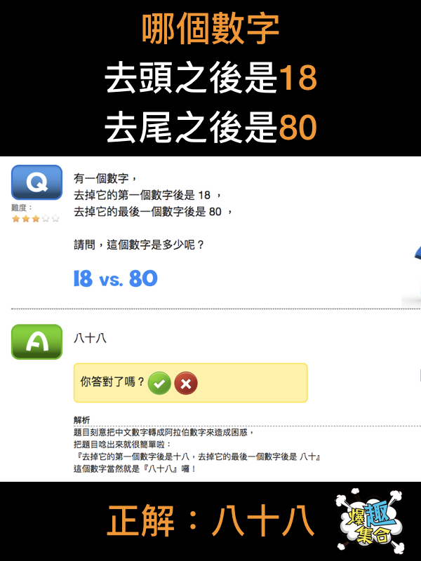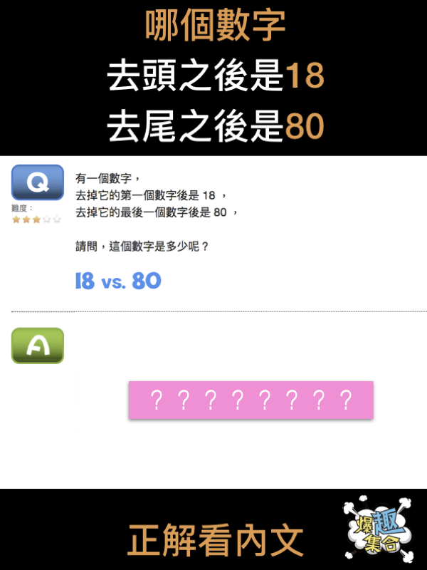 難倒百萬人 哪個數字去頭之後是18 去尾之後是80 .