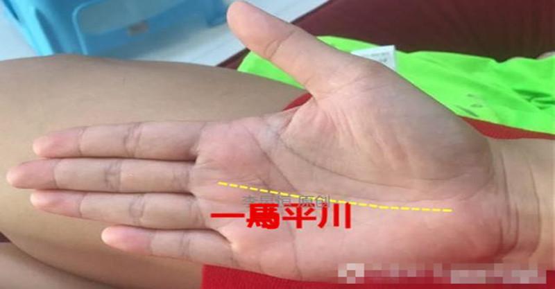 命運線直上穿過川字紋中的感情線「一馬平川」,富貴之象。