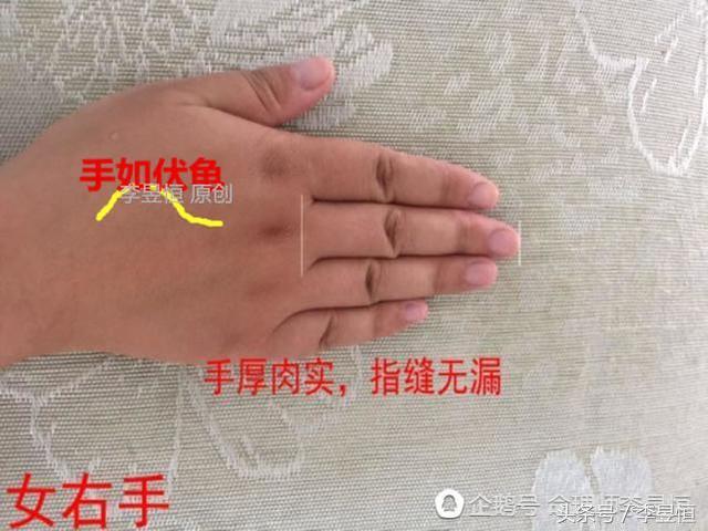 女性中指中正,君臣相佐,事業有成,錢財不斷。並且左右兩手短胖,屬於肉質手(下文解釋)。手麵上猶如水中或者地麵上的伏龜一樣高高凸起,「伏龜手」成相。素有「手如伏龜,富貴何愁」。