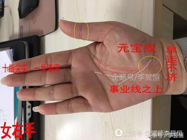 事業線與生命線及事業線構成內置小元寶紋,也就是說事業在波動求得發展之象。