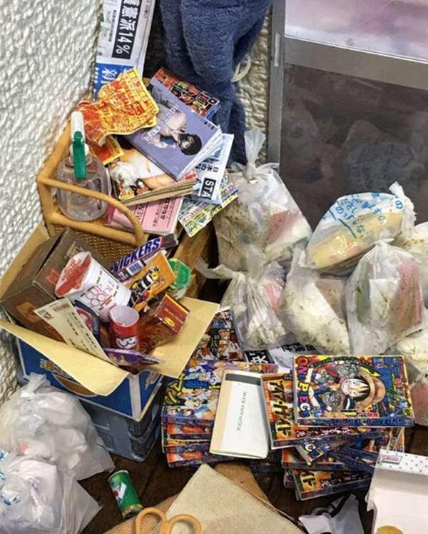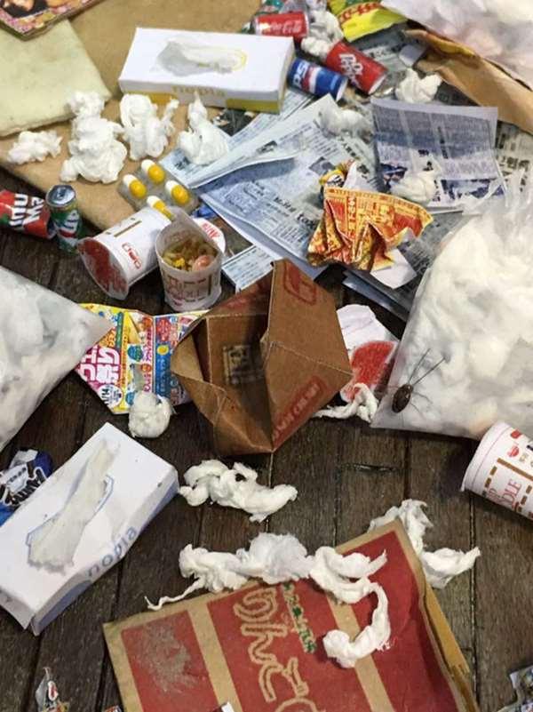 這些房間模型都出於員工Miwa Kojima的設計,他曾協助清理過300多間孤獨死房間,從模型中可看到孤獨死的房間通常會推滿垃圾,除了除了食物垃圾,塑膠瓶、塑膠袋中還裝有排泄物,混合屍臭,讓整個房間臭到不行。
