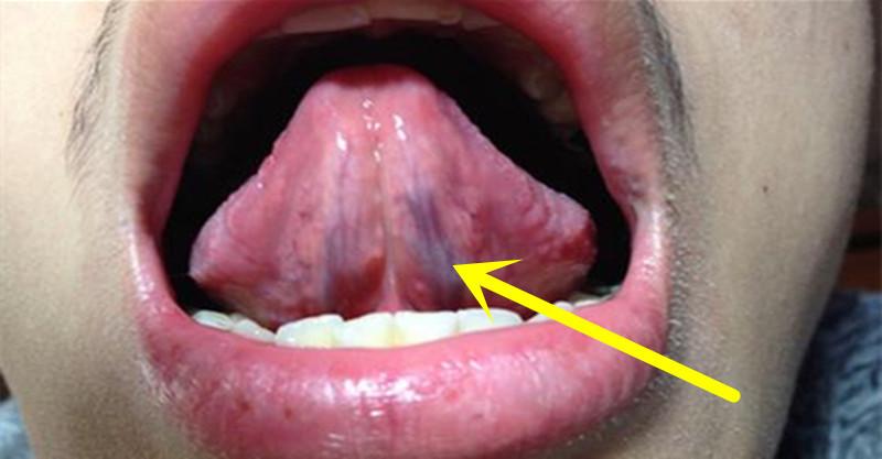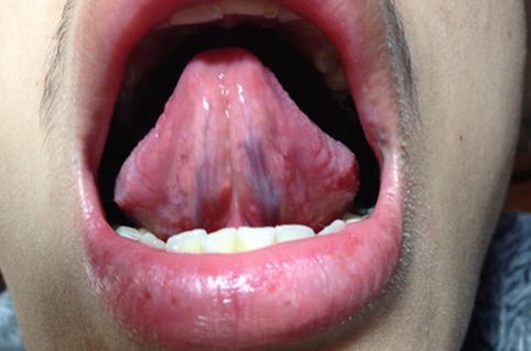上圖舌頭下麵兩條黑線是「舌下靜脈怒張」,出現這種情況,代表你身體出現了血瘀,血瘀是一種典型的亞健康狀況,其中主要癥狀是性情急躁、皮膚黯淡無光、女性痛經、畏寒怕冷、脫髮等。