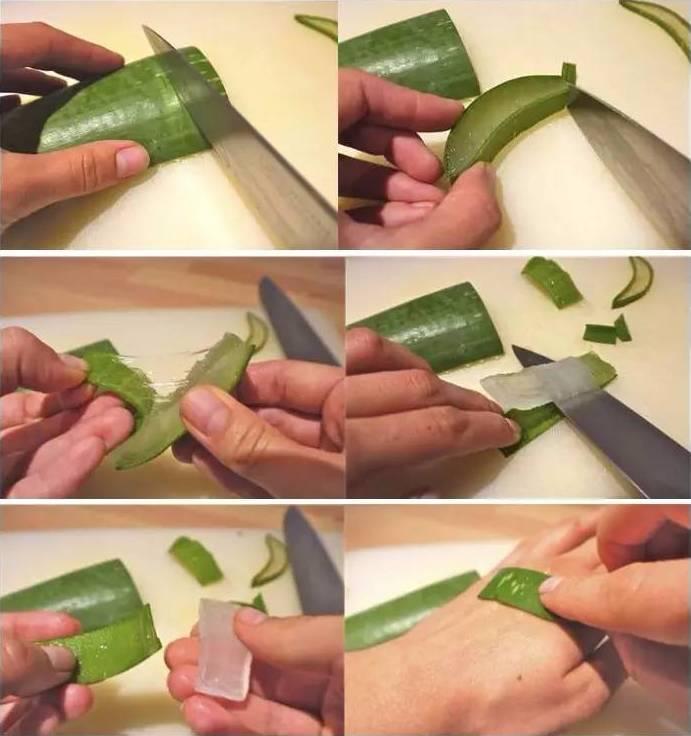 剪下蘆薈的葉片去掉兩端的齒狀,然後可以用小刀把蘆薈果肉取出,果肉可以食用,清熱下火;葉片上的蘆薈膠可以塗抹在皮膚上,美白保濕抗菌消炎,對曬後和蚊蟲叮咬都有舒緩的效果。