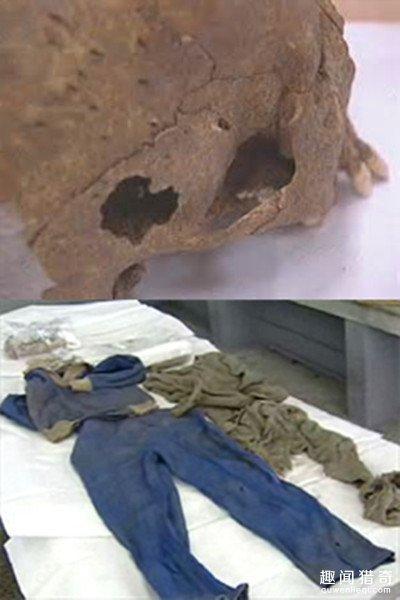 圖:挖掘出的顱骨和衣物