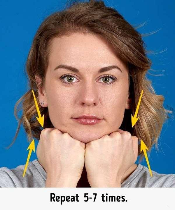 6、雙手握拳放在下巴下方,然後下巴用力往下張開,雙拳則是施力頂著下巴打開的力量,此動作維持3秒,重復5次!