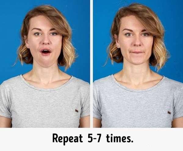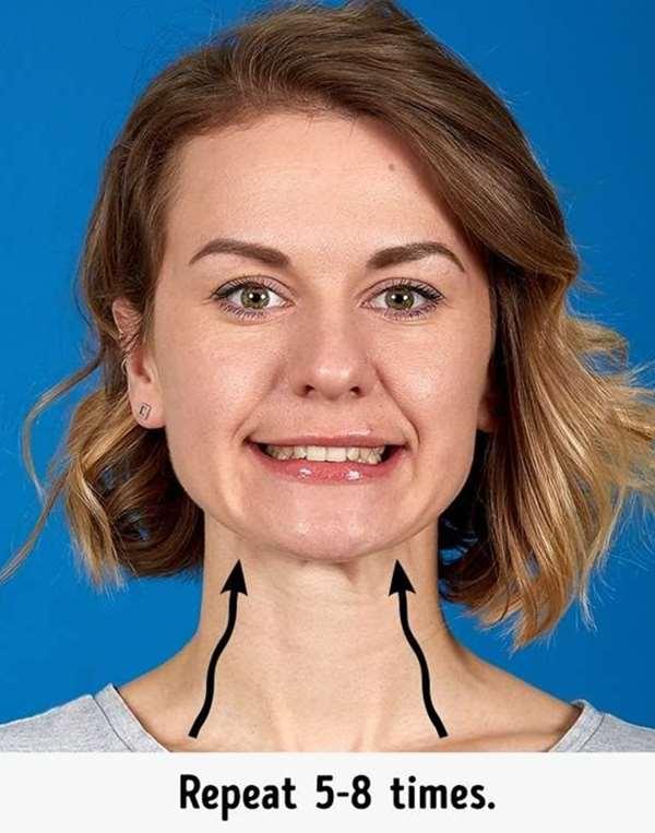 3、張開嘴巴,下唇在下排牙齒移動,低頭後再慢慢抬頭,同時把嘴巴閉起來,重復動作5次!