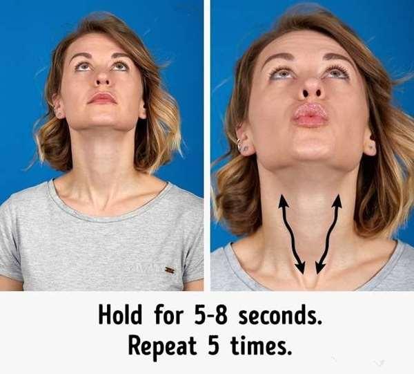 5、抬高頭,然後把嘴巴嘟起,下顎往前傾,會感覺到頸部又被拉緊!維持5~8秒,重復動作5次!