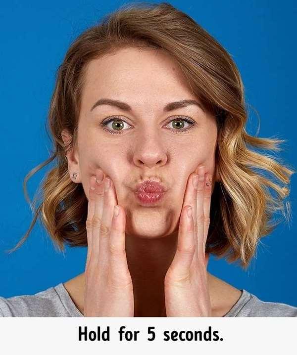 2、吸氣讓兩頰鼓起來,憋住後,用雙手壓住臉頰,感受到臉頰緊繃的肌肉,維持3~5秒,重復動作5次!