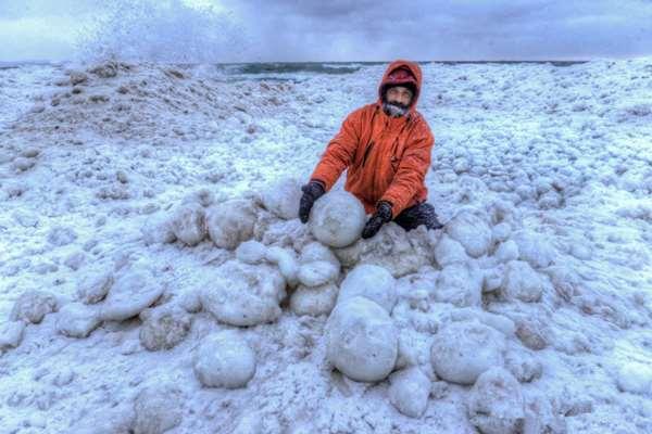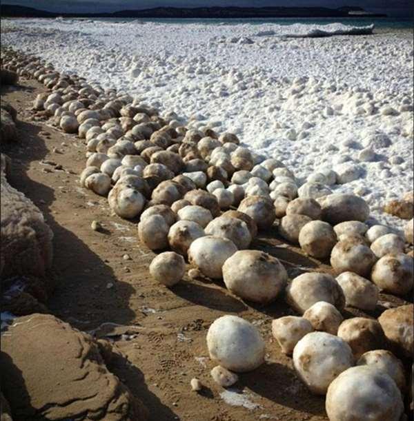這些冰球被海浪沖上岸後就擠在岸邊,像是人們將一顆顆的雪球擲進海裡再被沖上岸,看起來宛如巨型的冰蛋,而為什麼會發生這樣的奇景,也引發民眾的各種好奇。