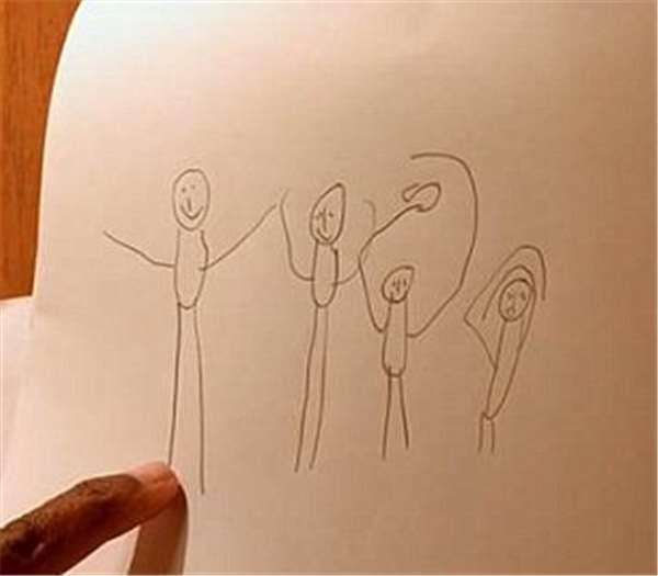 媽媽被放大了好幾倍,離他很近;爸爸卻隔得比較遠。