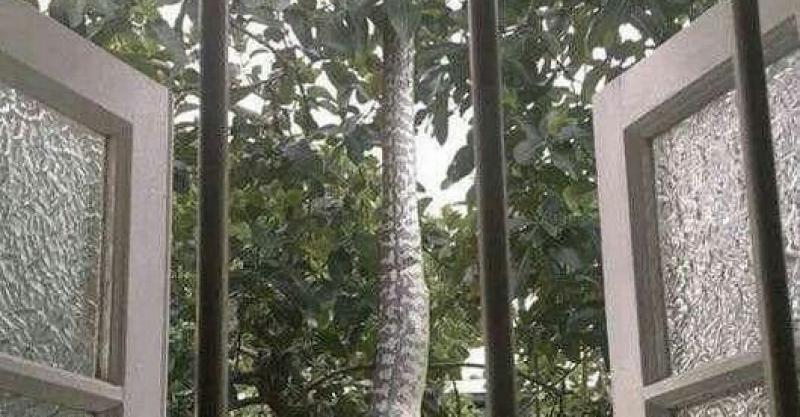 蟒蛇吃完了早飯將自己掛在樹杈上,正對著窗戶。像這種程度的蟒蛇,世界範圍內都很少見,更別說一大早開窗就看到了。不過女主人還是希望沒有看到,畢竟一大早來這麼一次驚嚇,誰都受不住。