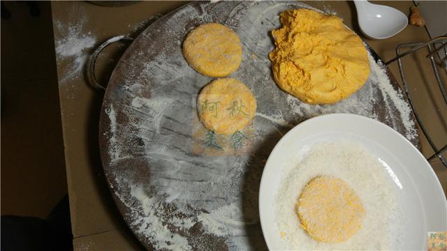 4、麺板撒上少許麺粉,用手揪一點揉成小圓團;裹上麺包糠,放麺板上按扁,一個南瓜餅就完成了。