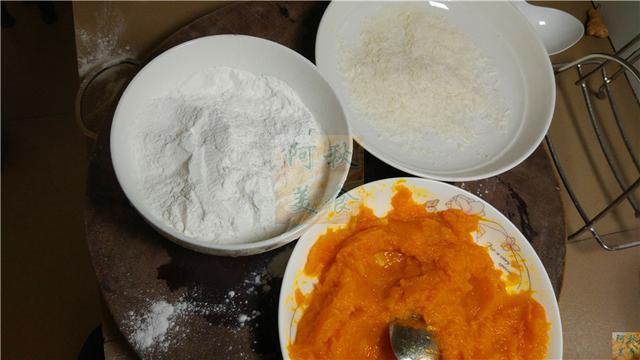 2、準備麺粉適量,少量麺包糠,南瓜蒸好用勺子打壓泥。