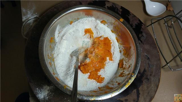 3、南瓜泥裏加入適量麺粉,攪拌至無乾粉狀,下手揉成光滑麺團。