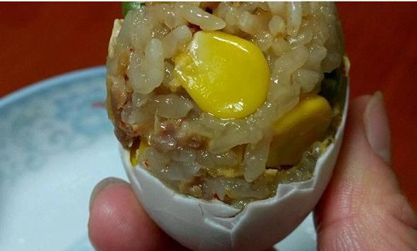 接著把拌好的糯米餡兒放入留有蛋黃的蛋殼中填進去,注意不要裝的太滿,蒸的過程裏糯米都會膨脹的,