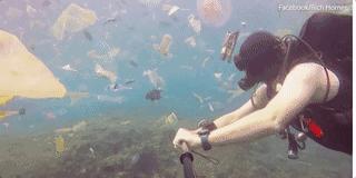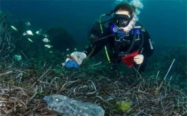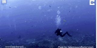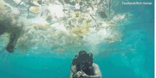潛水愛好者在水裡潛游不久,就會被各種垃圾纏繞,那生存在這片海域的動物,牠們的命運可想而知……