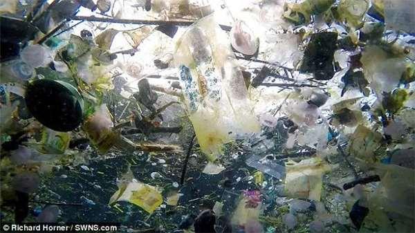 原本純淨透亮的海水裡,佈滿了各種垃圾物,其中多數是塑膠製品。