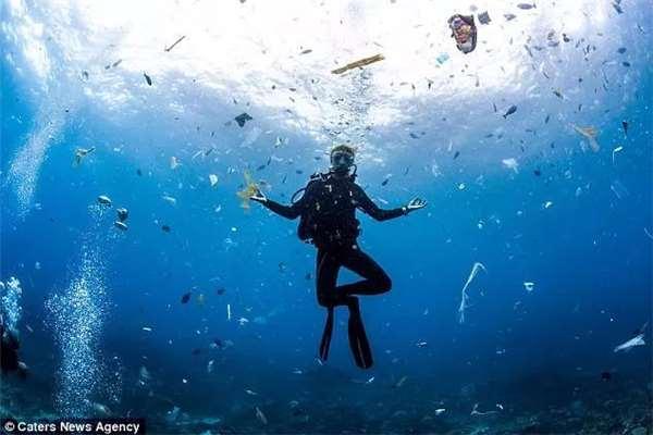 同樣在Manta Point,拍到「海洋垃圾風暴」的還有這位,來自芬蘭的水下攝影師Jukka Saari-korpi,當看到這一幕時,他在海水下做出無奈的姿勢,並和垃圾一起留下了合影。