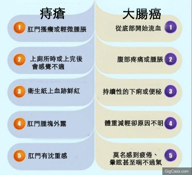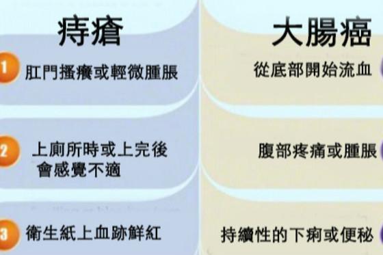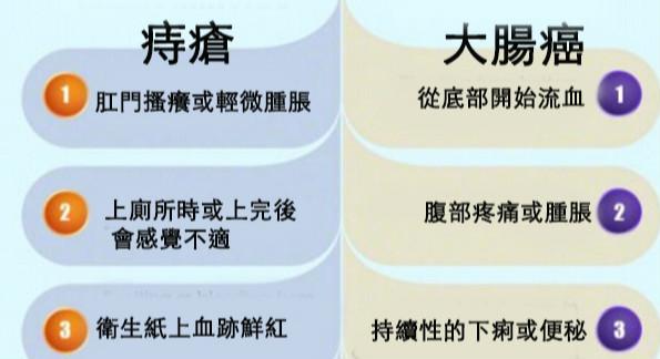 二.這是「大腸癌」和「痔瘡」的症狀比較,正確分辨疾病,才能早一點治療康復。