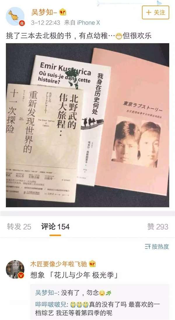 有網友留言《花少》的節目負責人吳夢知的微博,表達期待新一季節目,吳夢知回覆道:「沒有了,勿念」。