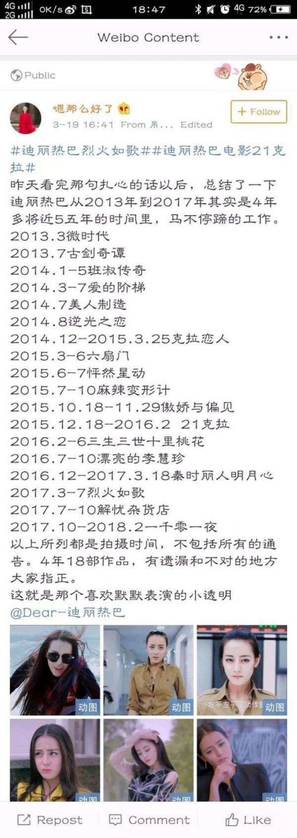 如果,從她自己嘴裡說出來的都是人設,那麼粉絲整理的這份日程表,已經可以看出,一部戲接一部戲的熱巴,真的很難有休息的機會和時間。