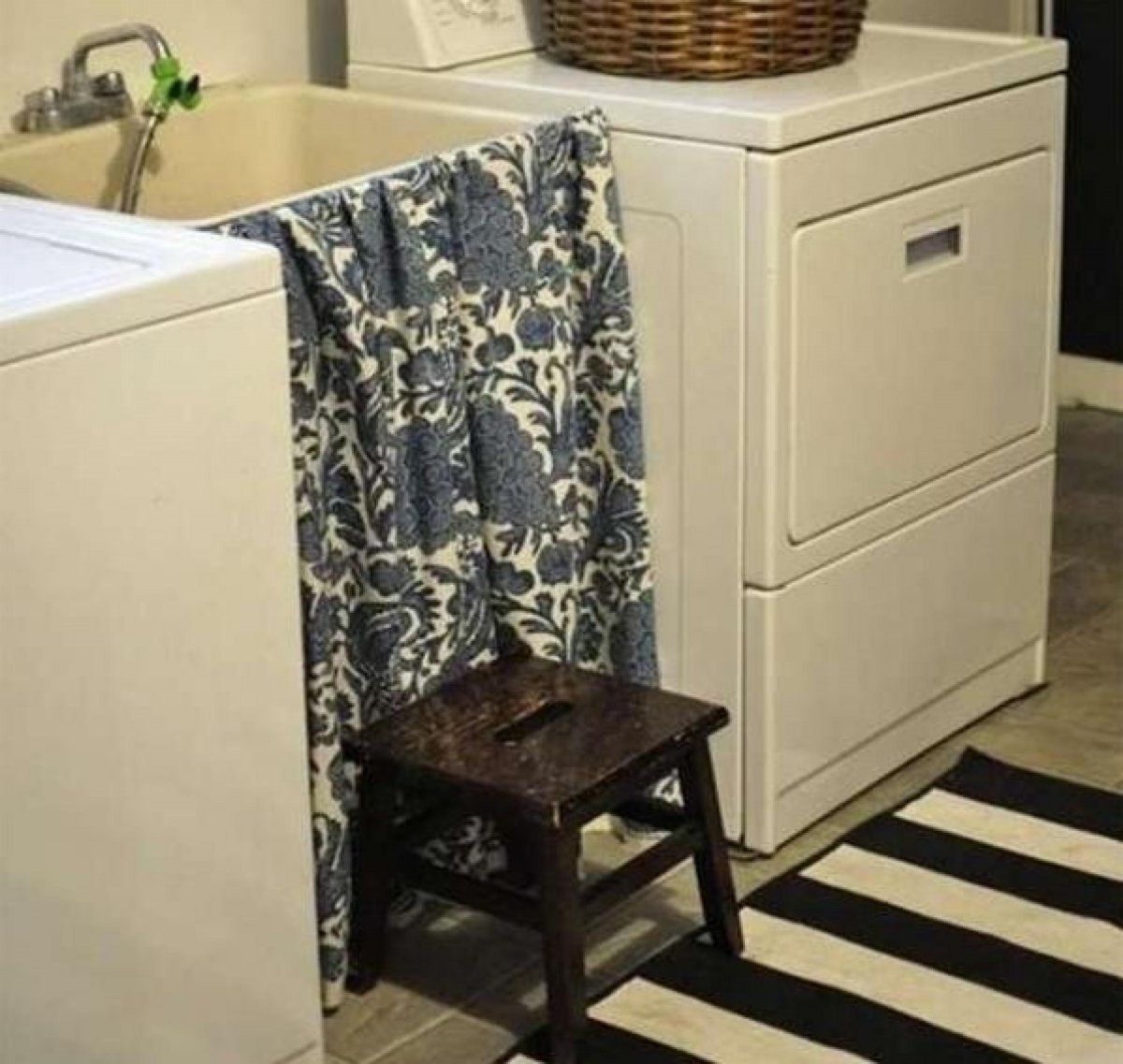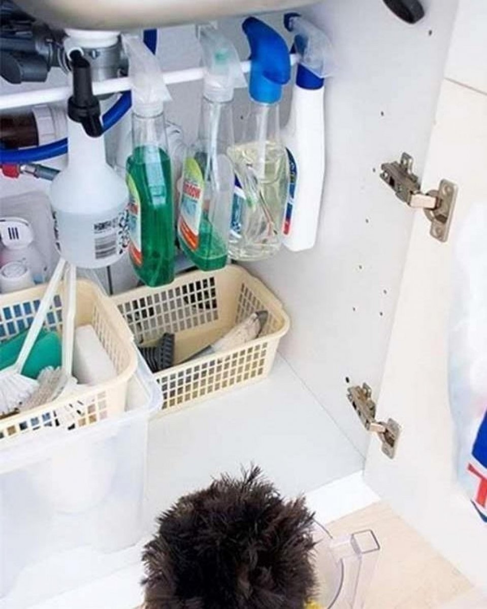 6、水槽下方雜物很多?用伸縮桿加上一塊布,就能輕鬆解決。