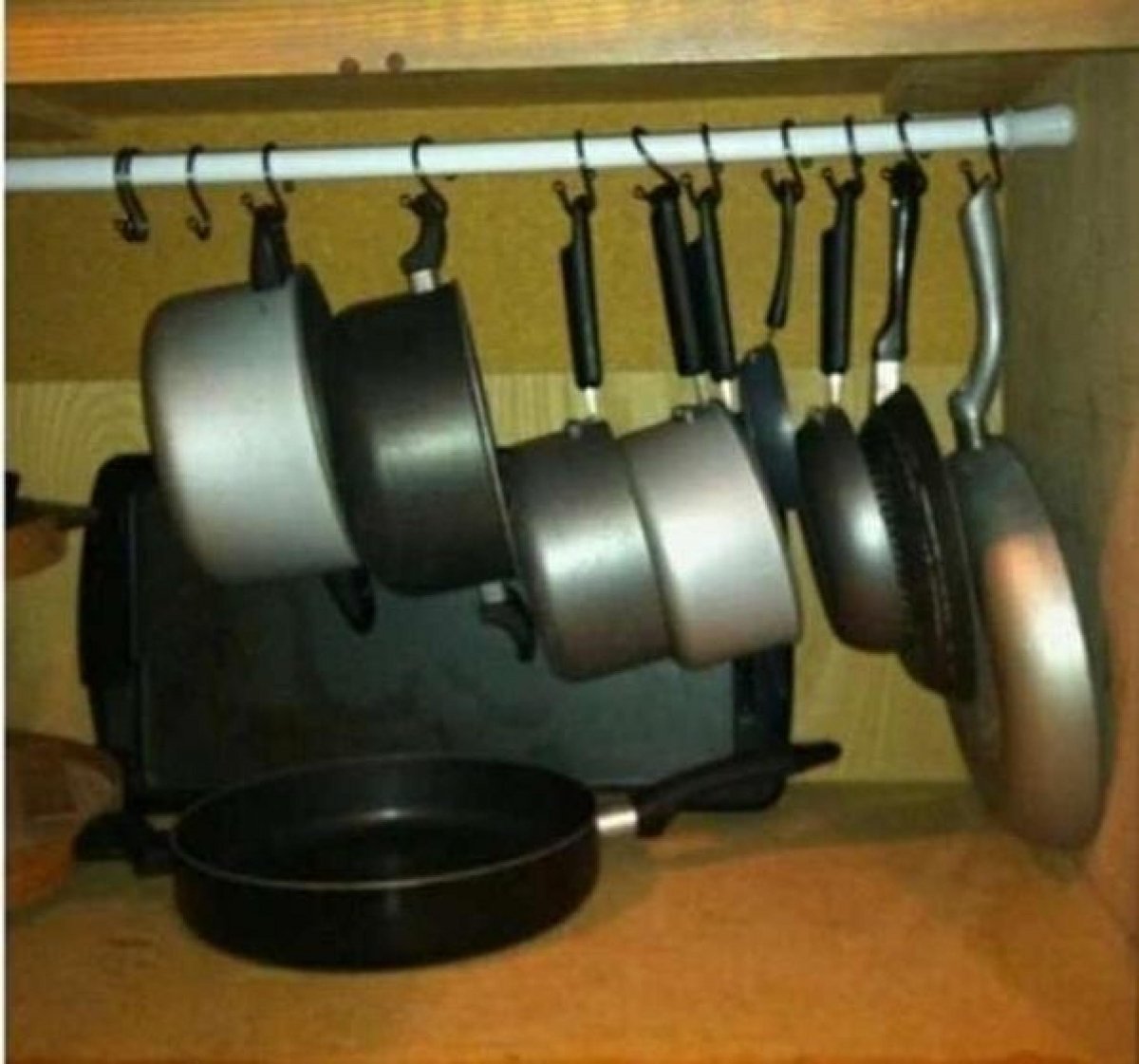 11、鍋子疊在一起,拿的時候很不方便!只要用伸縮桿把它們掛起來就好拿多了。