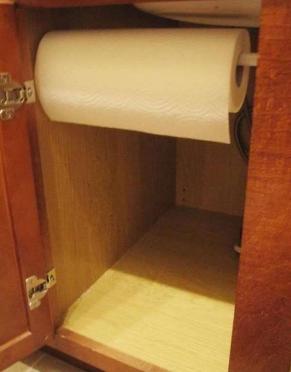 5、廚房紙巾總是不知道要放哪裡?用伸縮桿做一個紙巾架吧!